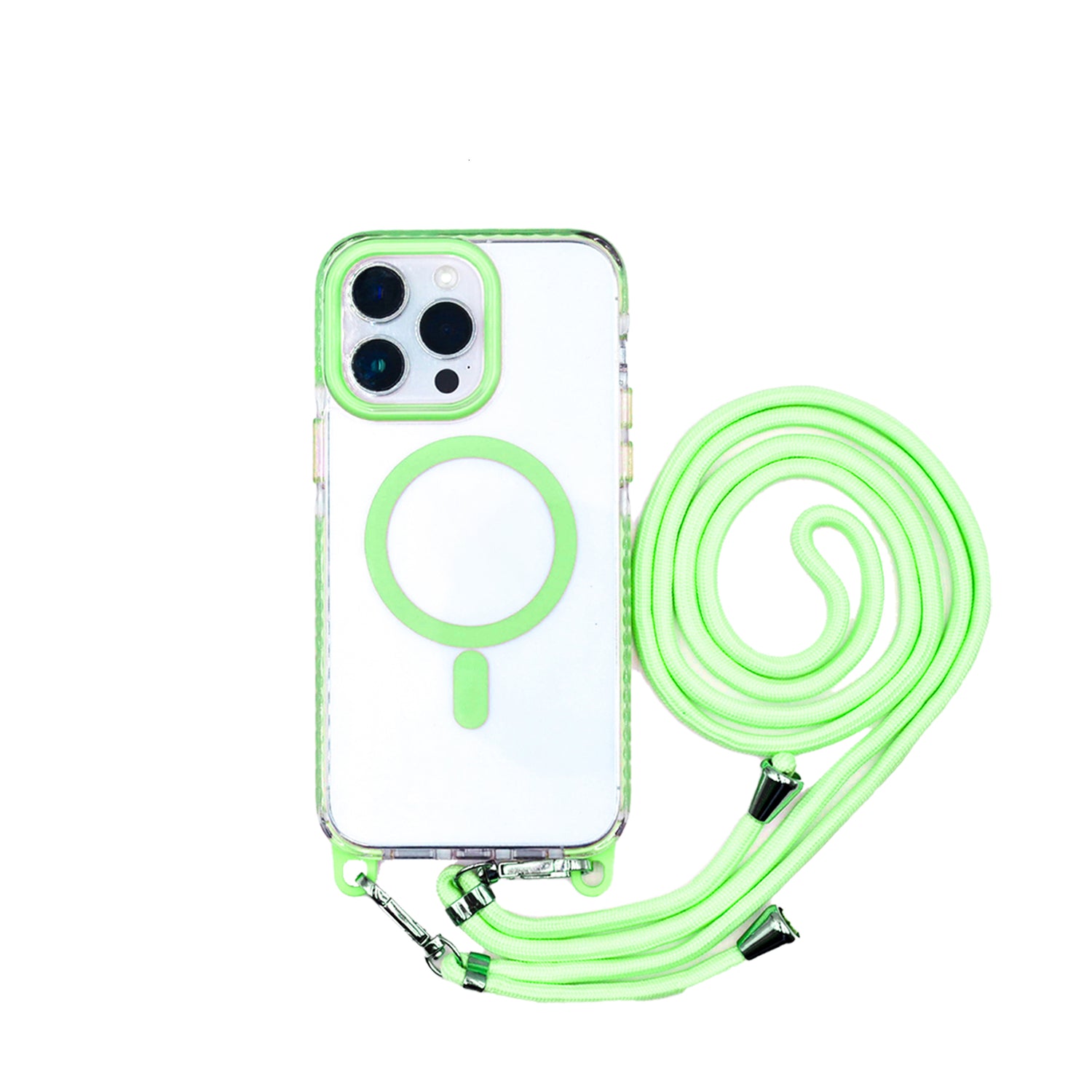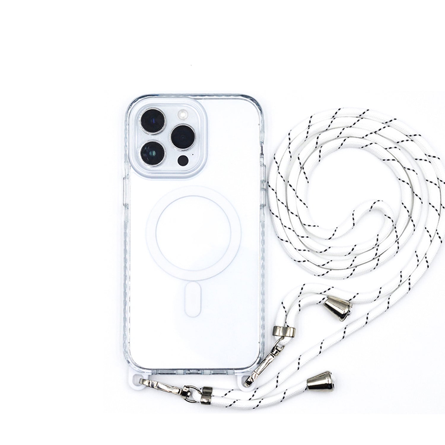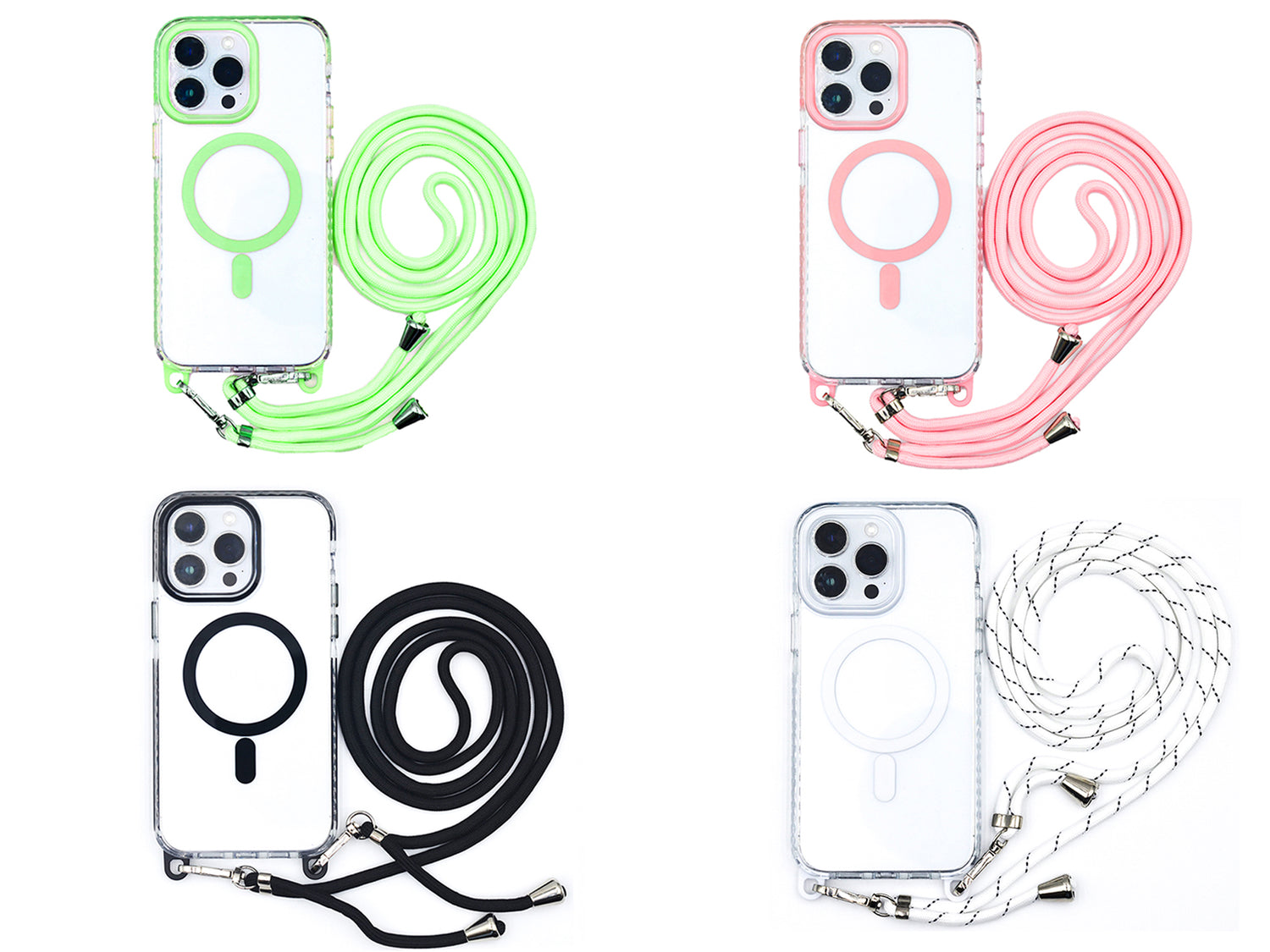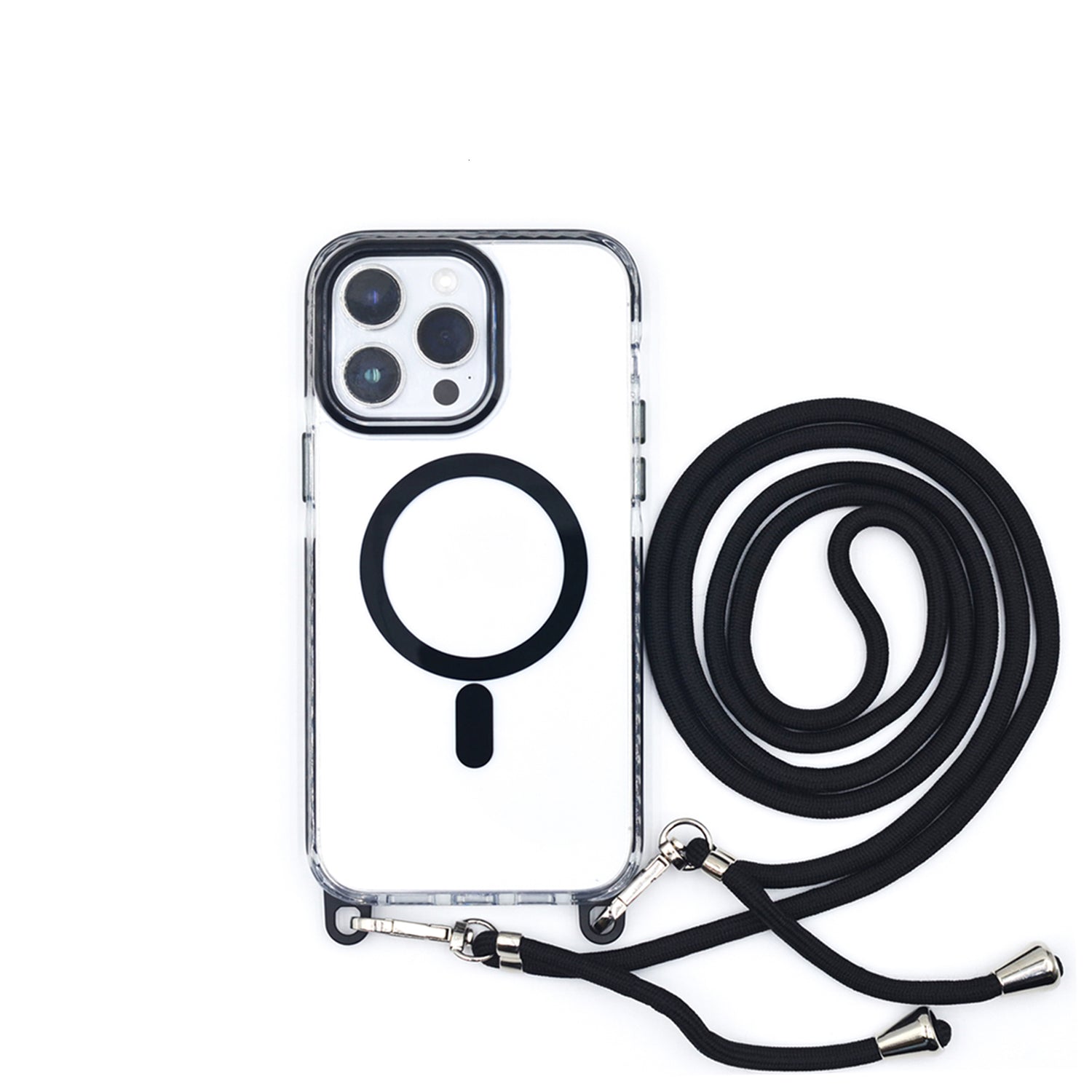 - Cuerda Desmontable: Viene con una cuerda o correa ajustable y desmontable que permite llevar el iPhone de manera cómoda y segura, colgándolo del cuello, hombro o muñeca.