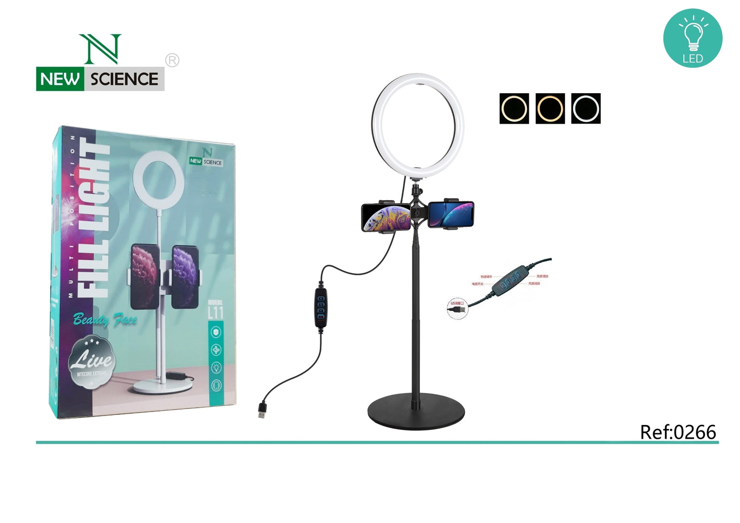 Multifunction ring light with double mobile phone holder.