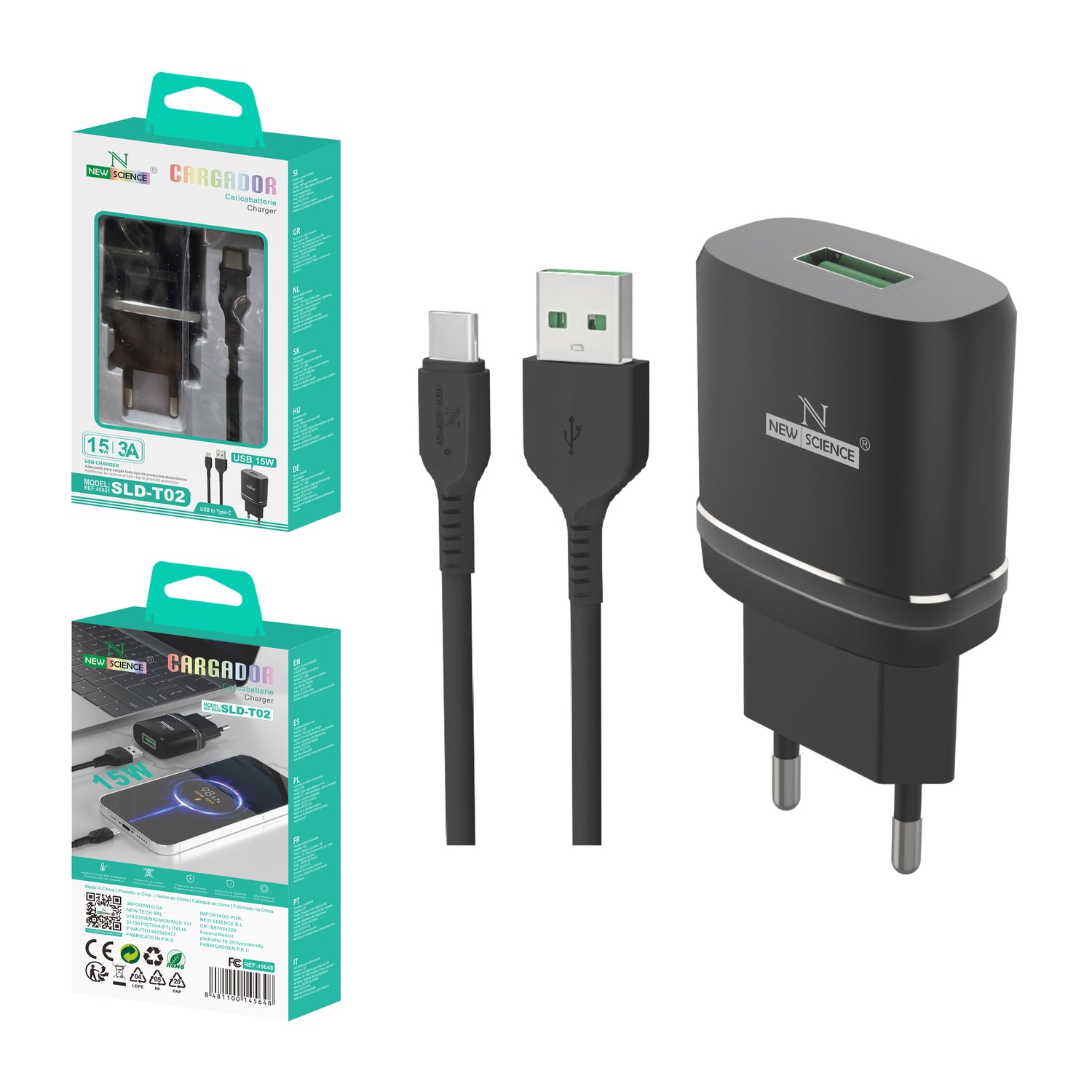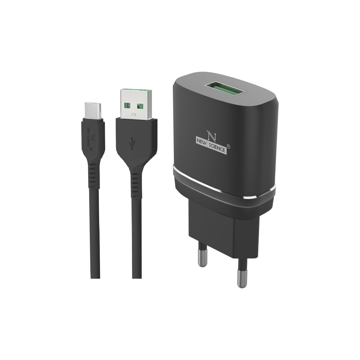 Charger with 15 watt (W) USB input with Micro USB charging cable, designed to efficiently charge Android devices compatible with fast charging.