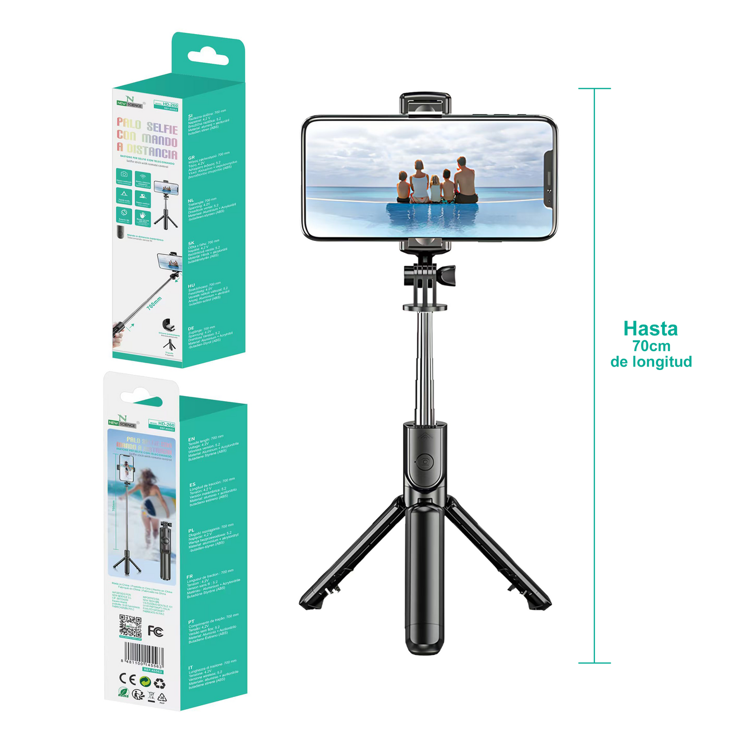 ¡Captura tus momentos favoritos de forma práctica y sin esfuerzo! El palo selfie HD-260 combina un diseño compacto con funciones inteligentes como control remoto inalámbrico, rotación 360° y modo trípode, ideal para selfies, grabaciones, vlogs y más.