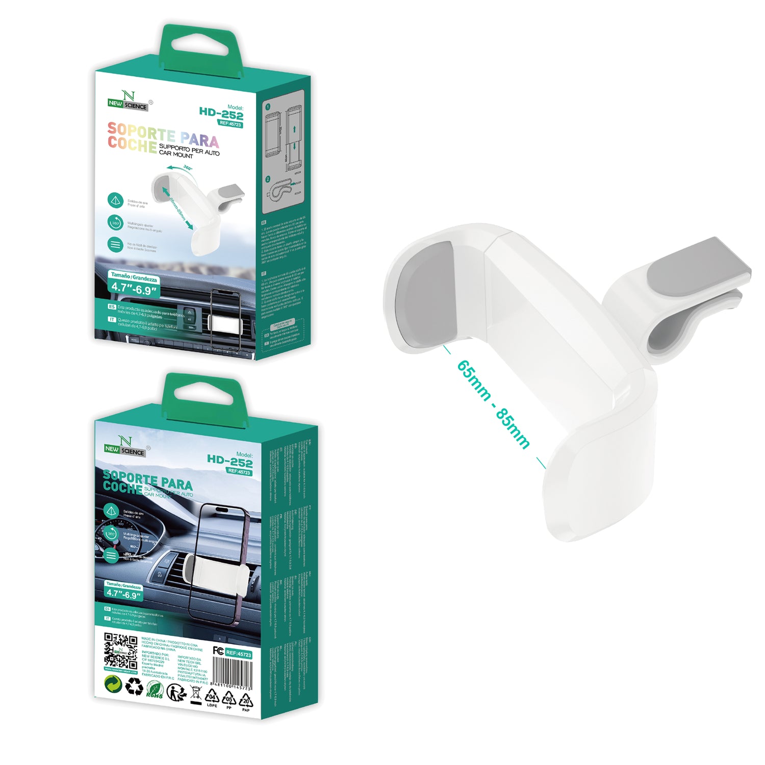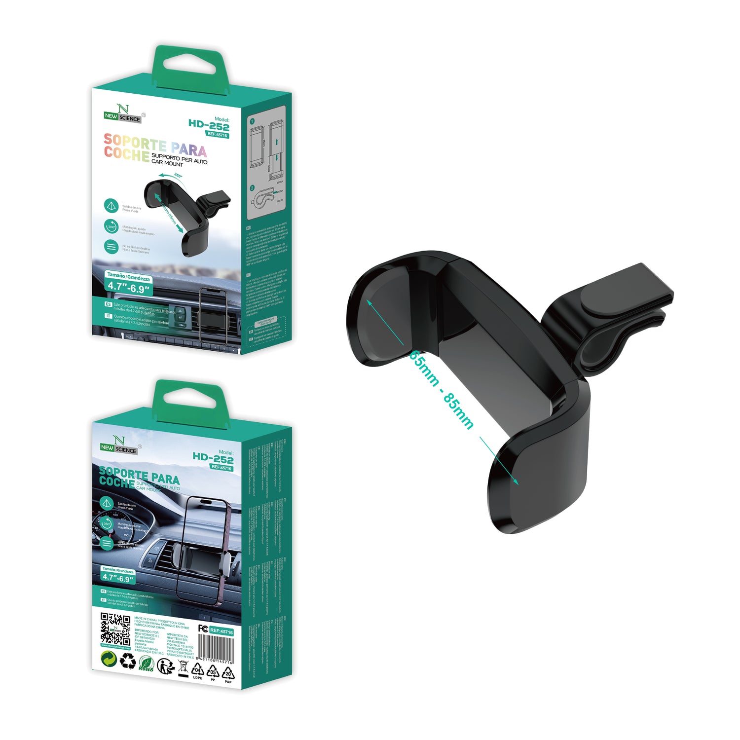 Este soporte compacto y elegante se instala fácilmente en las salidas de aire del coche, proporcionando una sujeción firme para teléfonos de 4.7" a 6.9". Su diseño antideslizante evita movimientos inesperados durante la conducción, mientras que la rotación de 360° permite ajustar el ángulo ideal de visualización. Con un rango de ajuste de 65 a 85 mm, es compatible con la mayoría de los smartphones del mercado.