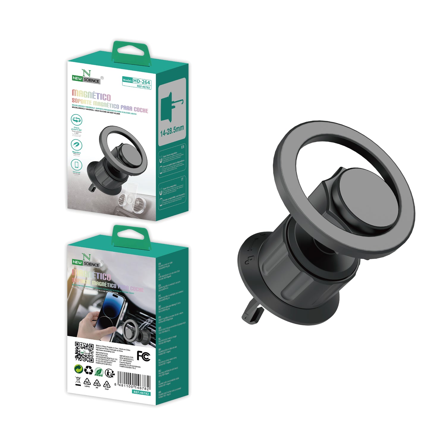 El HD-264 es un soporte magnético compacto y elegante para automóvil, ideal para sujetar tu smartphone de forma rápida y segura mientras conduces. Se instala fácilmente en la rejilla de ventilación y ofrece una rotación de 360°, permitiéndote ajustar el ángulo de visión según tus necesidades.
