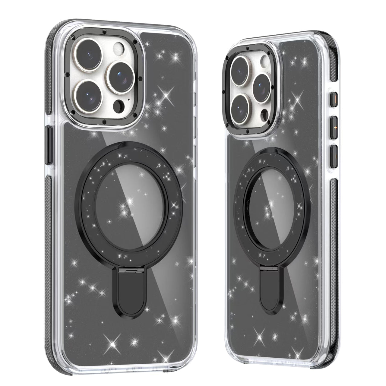 Dale un toque de elegancia y brillo a tu móvil con esta funda magnética compatible con MagSafe. Su diseño transparente con purpurina ofrece un efecto luminoso espectacular, mientras el soporte plegable integrado permite ver vídeos o hacer videollamadas cómodamente.