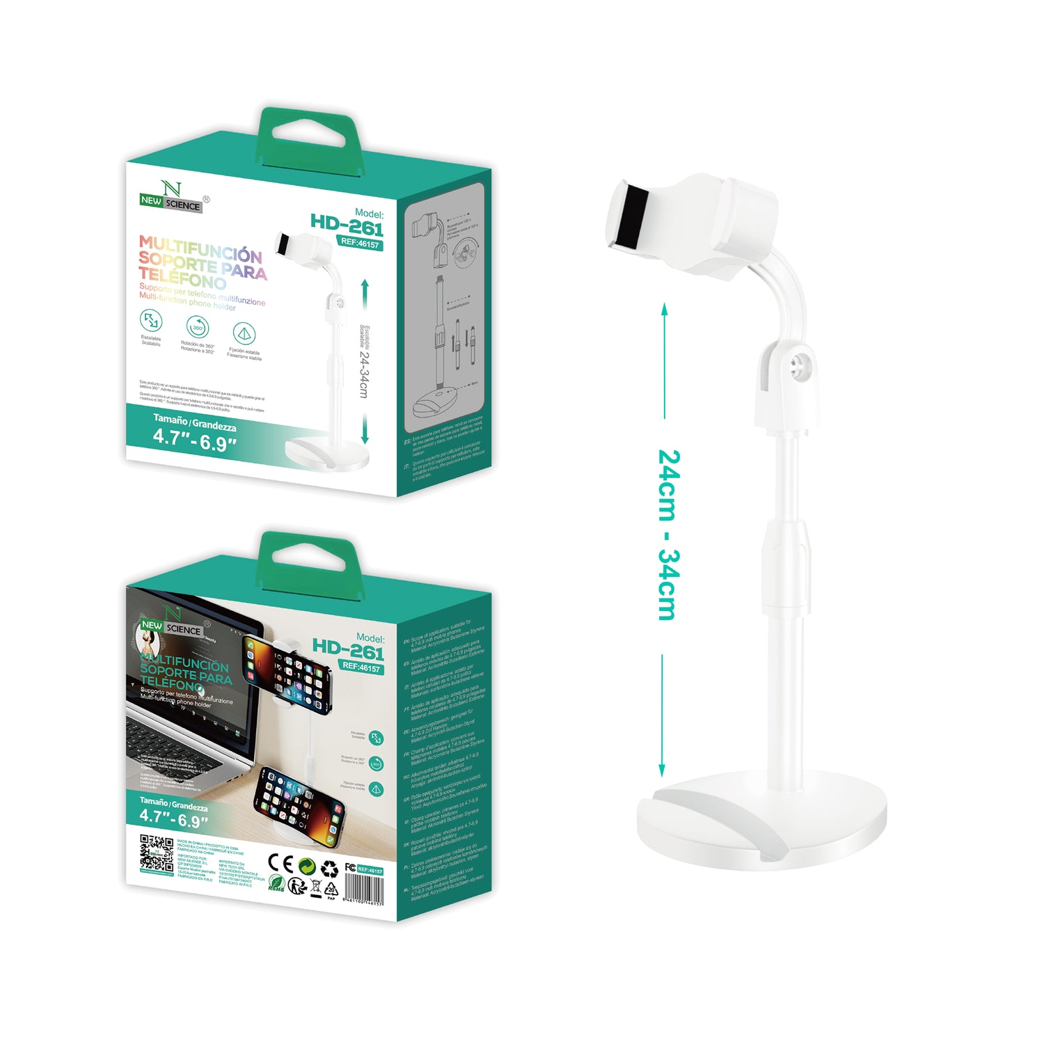 El HD-261 es un soporte multifuncional con diseño ajustable en altura y rotación de 360°, ideal para videollamadas, grabaciones, clases online, visualización de contenido o trabajos de escritorio. Compatible con smartphones de 4.7″ a 6.9″, se adapta a tus necesidades diarias con estabilidad y estilo.