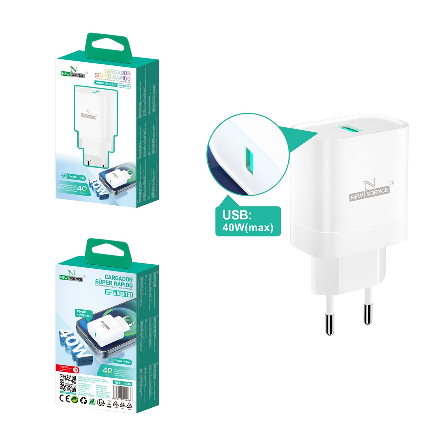 Adaptador enchufe con conector USB de 40W carga rápida.
