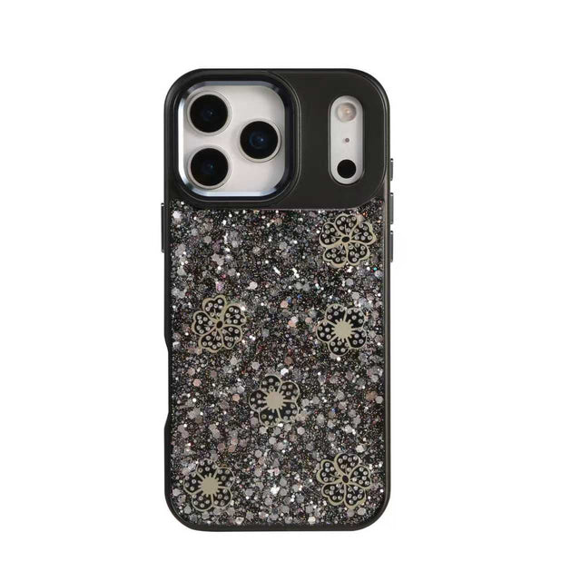 Diseño con glitter y flores que aporta un efecto brillante y sofisticado bajo la luz.