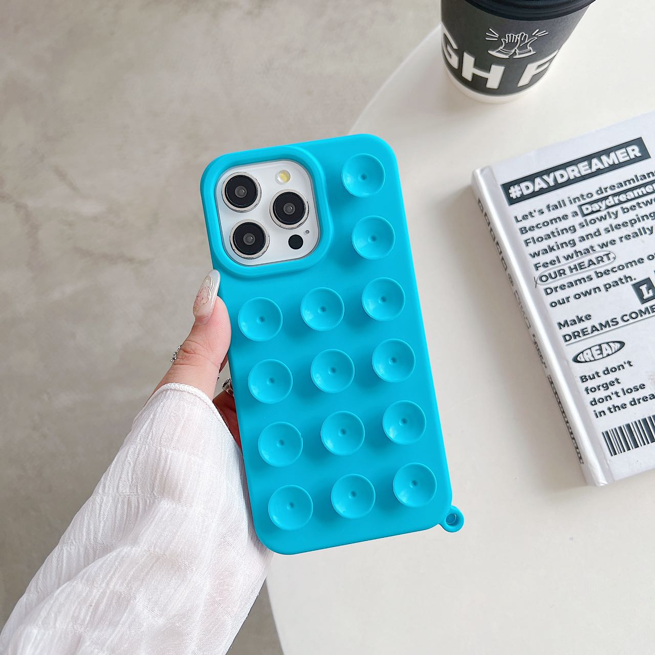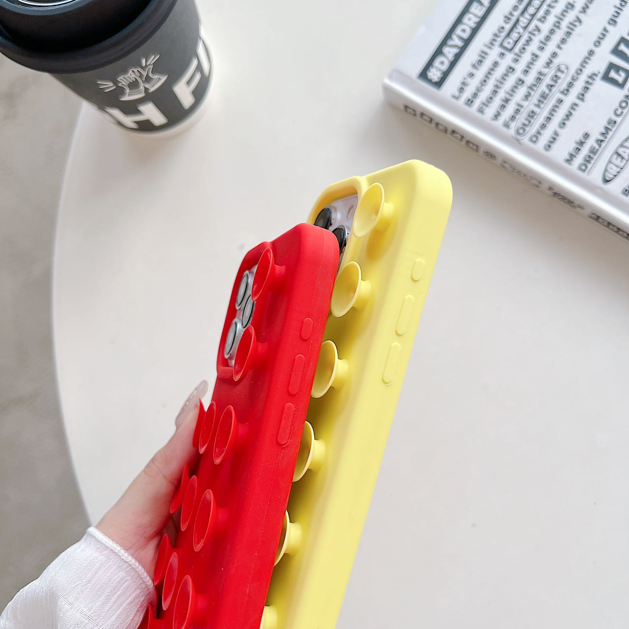 ¡Diversión, color y funcionalidad en una sola funda! Esta funda de silicona con diseño de burbujas tipo pop y pequeñas ventosas no solo protege tu móvil, sino que también es ideal para liberar estrés y pegarse en superficies lisas como vidrio o azulejos.
